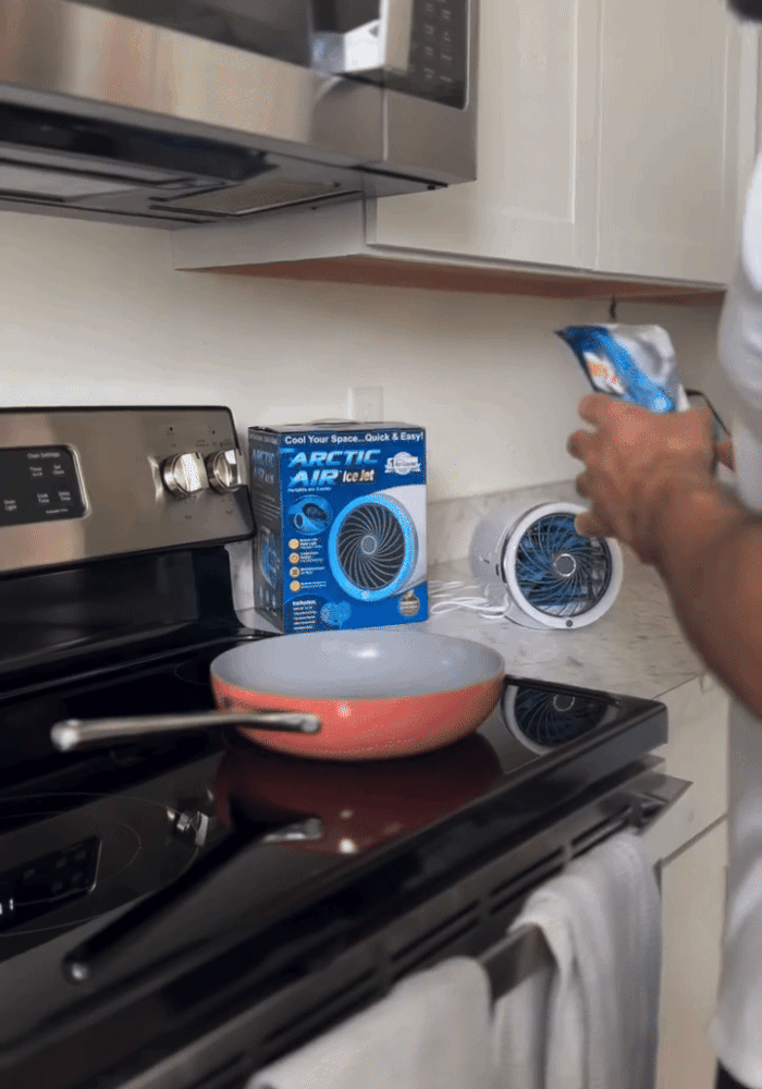 Arctic Cool Ice Jet – A compact personal air cooler with 2X cooling power and built-in LED night light, perfect for beating the heat in small spaces like bedrooms, offices, kitchens, and more.