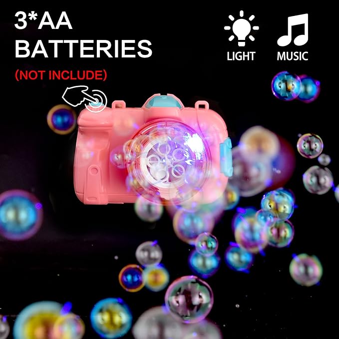 High Quality Bubble: These bubble makers use certified non-toxic bubble liquid, ensuring safe and premium playtime. The bubble cameras meet US Toy Safety standards, offering peace of mind. Note that 3 AA batteries are required for operation (not included).