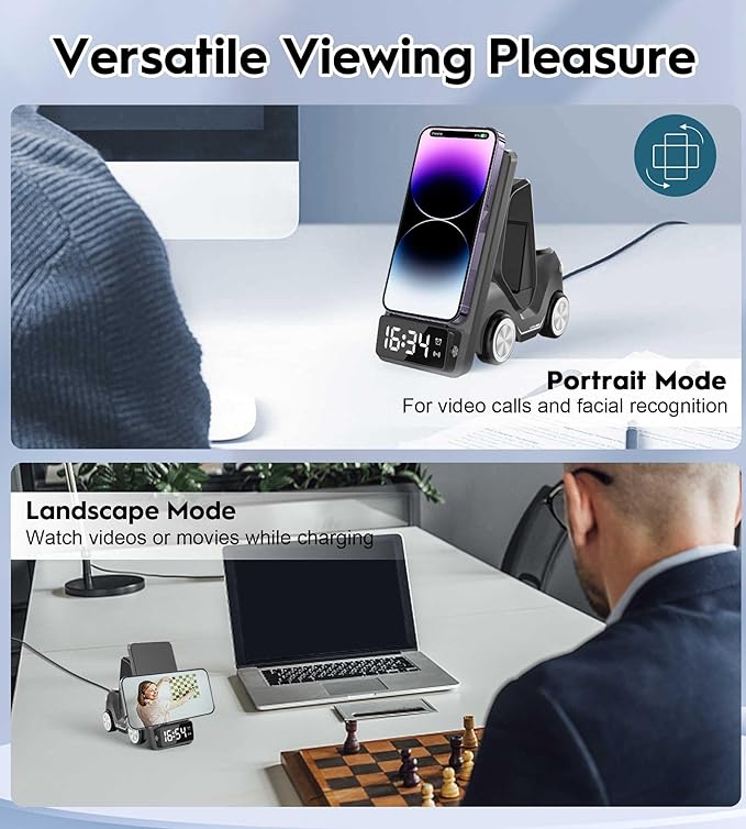 ? Multi-angle viewing – Adjustable stand allows portrait or landscape mode for calls, video streaming, or facial recognition while charging.