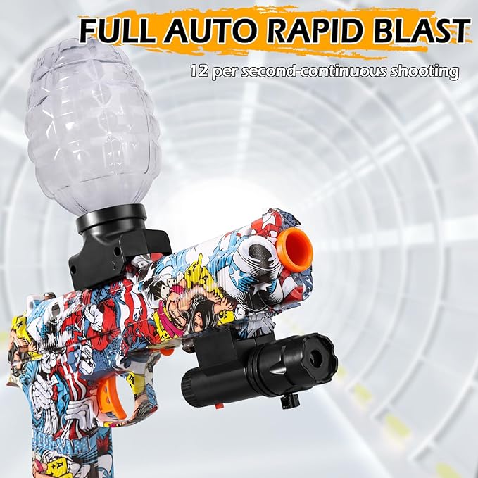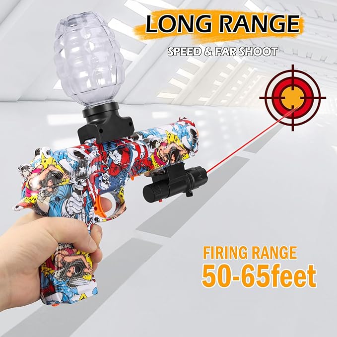 - Electric Gel Ball Blasters: Powered by a rechargeable all-in-one battery for extended battery life and easy charging. Automatic firing with a range of 45-60 feet, offering consistent accuracy and rate of fire.