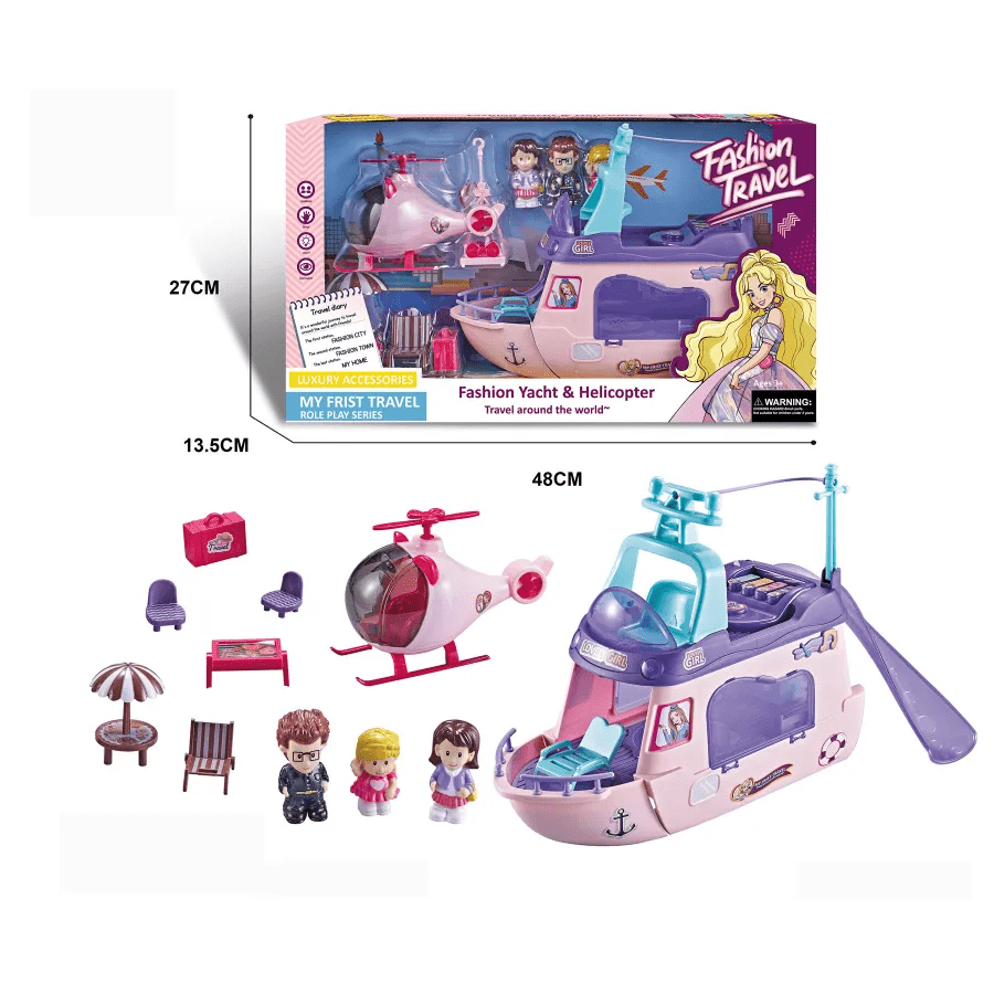 Let kids set sail on endless adventures! ??? The Fashion Yacht & Helicopter Playset brings fun roleplay with a stylish yacht, helicopter, mini furniture, and cute dolls. Perfect for storytelling, pretend play, and travel-themed adventures ????. Kids can enjoy beach vibes, sky rides, and luxury travel in one exciting toy set! ??
